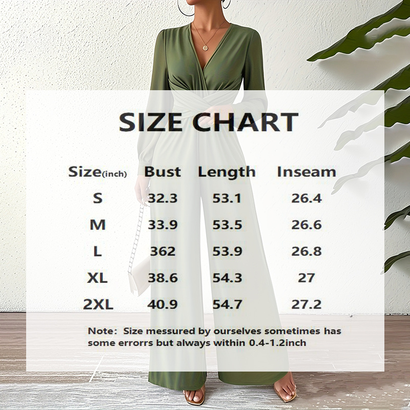 Discover the ultimate in sophisticated dressing with our Women’s Elegant Jumpsuit. This all-in-one outfit masterfully combines style and ease, featuring a flattering cross-wrap V-neckline that elegantly frames the décolletage . The elasticized cuffs on the long sleeves and the defining self-tie belt create a polished, tailored silhouette that is both modern and timeless. Its sleek solid color and wide-leg design make it a powerful choice for commanding attention in the office, at a formal dinner, or any special event.