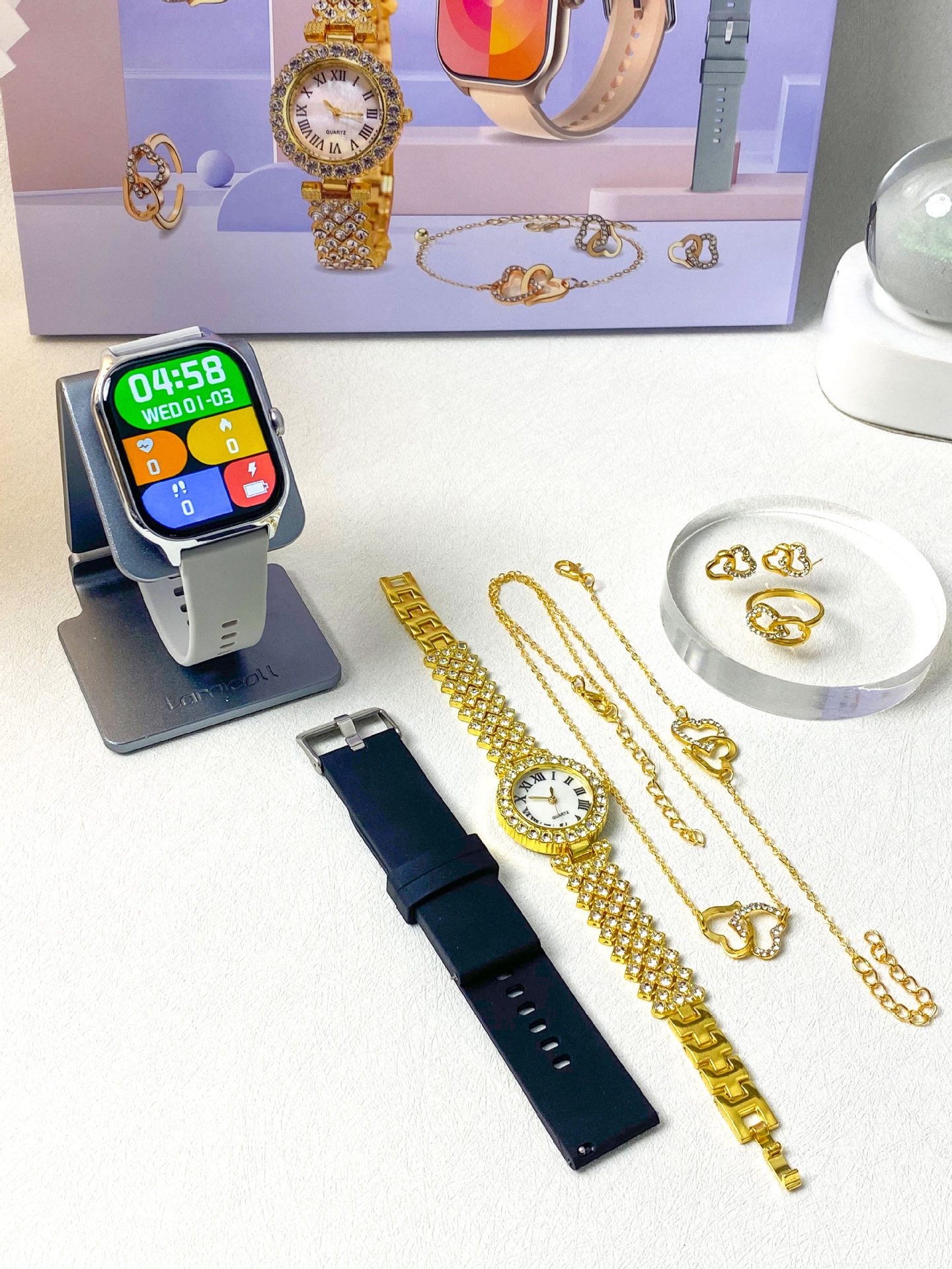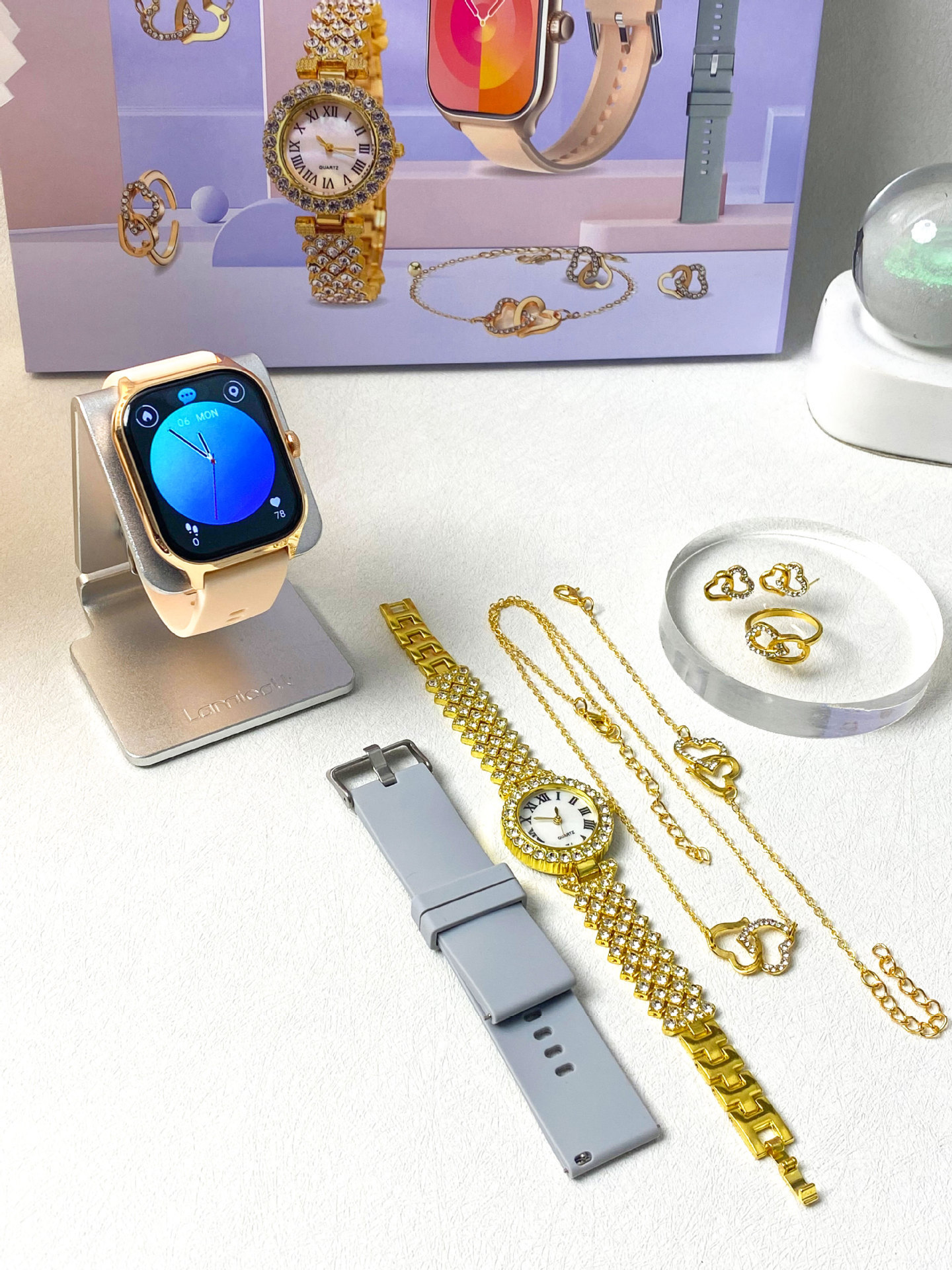 Smart Watch, female watch, strap * 2, ornament, charging cable, manual, gift box